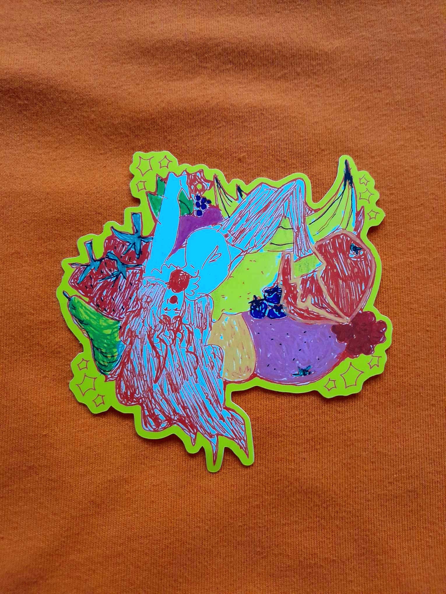 My largest vinyl sticker yet! At 10cm, this sticker is a matte finish and full of fruit! If you enjoy clowns, fruit and the colour yellow, then you maybe will enjoy this indulgent clown.